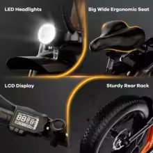 Equipped with 20” fat tires, this e-bike ensures excellent grip and stability across various surfaces — from pavement to gravel to sand. The durable frame and front suspension system provide enhanced shock absorption for a smoother, more comfortable ride.