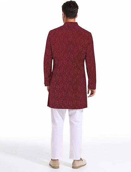 Features: These mens modern Kurta Sherwani blazers design with mandarin collar, button closure, long sleeve with button design, two side pockets, fake chest pocket and paisley pattern. Notice: The jacket includes a fully polyester lining. The jacket is not breathable beacause of non-breathable lining and not suitable for use in very athletic activities, suitable for gentle activities.