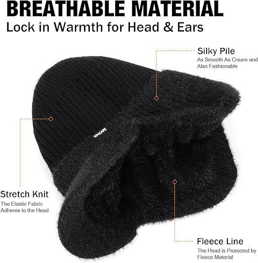 Wmcaps Winter Beanie with Brim and Ear Flaps, Fleece Lined Warm Knit Hat for Men Women Outdoor Thermal Stocking Cap.