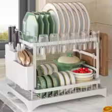 2-Tier Large Capacity: The double-layer design provides significantly more storage than single-tier racks, accommodating a large volume of plates, bowls, mugs, and other kitchenware.