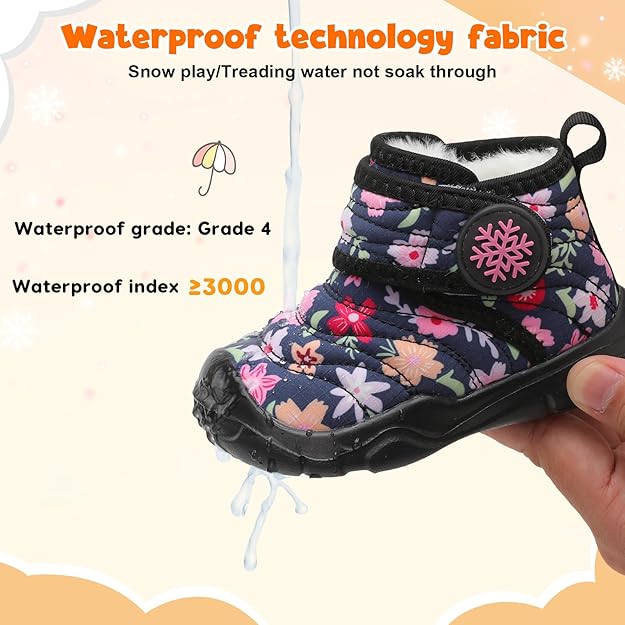 Faux Fur Warm Lining:Soft short fur lined and detachable insole.Thick warm fluff lining block the outside cold,make sure your baby entire foot is surrounded by warmth.Moisture-wicking velvet lining keeps baby's feet comfortable all day