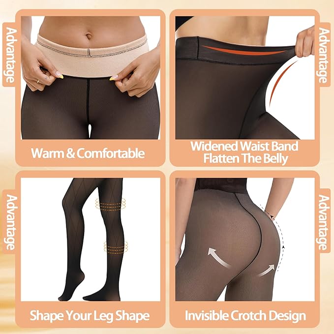 【Fake Translucent pantyhose】:This translucent fleece leggings are fashionable. The winter tights look like a sheer stocking from the outside but fill with warm fleece in the inside.You wear this fake translucent tights in autumn and winter, not only to show your sexy figure, but also to keep you warm.