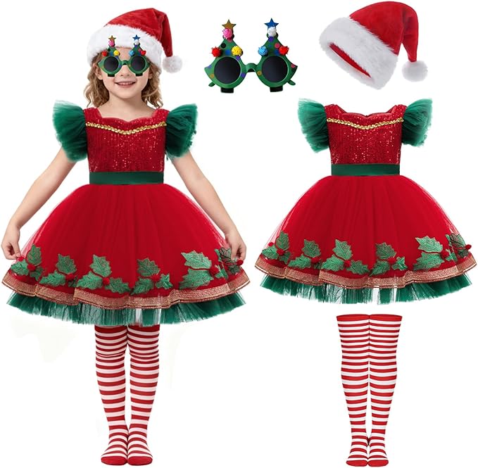 Christmas Girl Dress Set: This adorable Christmas-themed set includes a tulle skirt with red pom-poms, a Santa hat, a pair of Christmas stockings, and uniquely shaped tree-patterned sunglasses.