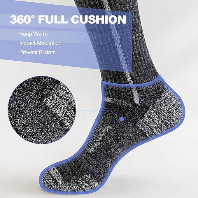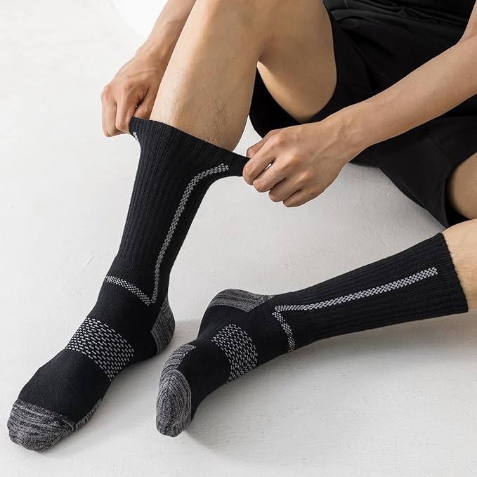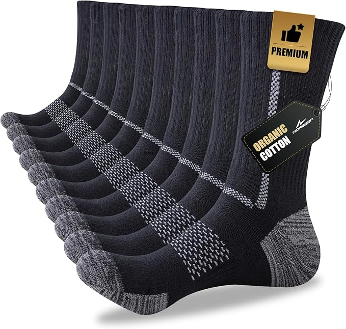 Niorasen Premium Performance Crew SocksExperience the perfect blend of luxury and durability with Niorasen men's crew socks. Designed for all-day wear, these socks provide superior comfort and support for work, sports, and everything in between.Key Features & BenefitsFeatureDetailed DescriptionYour AdvantageUltimate Cotton SoftnessCrafted with 78.6% high-quality cotton, making them incredibly soft, gentle, and non-irritating on the skin.All-Day Comfort: Excellent breathability and warmth suitable for all shoe sizes and types.Full-Foot Enhanced CushionFeatures a comprehensive terry cushion throughout the entire foot and calf area.Impact Absorption: Superior padding protects against friction, absorbs shock, and helps relieve foot pain and soreness during intense activities like hiking or running.Reinforced DurabilityStrategically designed with reinforced toes and heels built to withstand heavy use and high-friction.Long-Lasting Value: Ensures the socks remain intact and durable, making them ideal for strenuous work and athletic performance.Targeted Arch SupportEquipped with integrated support designed to gently compress and stabilize the arch.Fatigue Reduction: Improves blood circulation and reduces strain, helping you stay energized and comfortable throughout long shifts or activities.Superior Moisture ControlUtilizing premium cotton and unique knitting techniques to efficiently manage sweat and moisture.Stay Dry & Fresh: Highly breathable fabric keeps your feet dry and comfortable, excelling during hiking, running, and all sporting occasions.