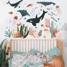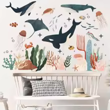 With a soft watercolor style and soothing colors, these decals create a calm yet imaginative atmosphere—perfect for nurseries, children’s bedrooms, playrooms, or any ocean-themed space.